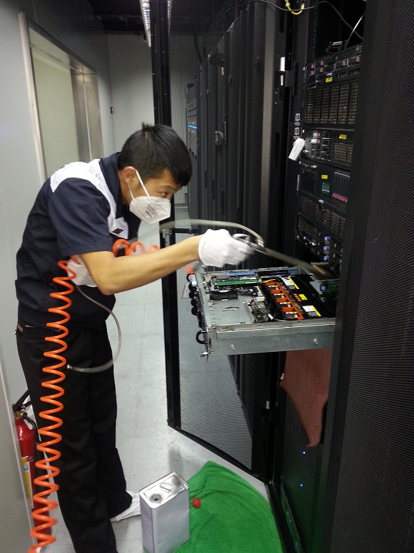 除此之外,由于灰尘中含有水分和腐蚀物质,使相邻印制线间的绝缘电阻下降甚至短路,影响电路的正常工作,严重的甚至会烧坏电源主板和其他设备部件。过多的干灰尘进入设备后会起到绝缘作用,直接导致接插件触点间接触不良。同时,会使设备动作的摩擦阻力增加,轻者加快设备的磨损,重则将直接导致设备卡死损坏,可见灰尘对服务器的危害是非常大的。 随着社会的发展和科技的进步,各行业精密设备管理及维护技术向高科技发展是社会的必然,公司带电清洗维护技术是将原来的事后停电“抢修”转为不受时空限制的带电作业;将表面、简单的“擦、吹”转变为深度、彻底、全面的保洁维护。机房除尘由停电作业转变为带电维护,是对全社会设备维护技术的一次革新,是对社会发展和文明进步的积极贡献。